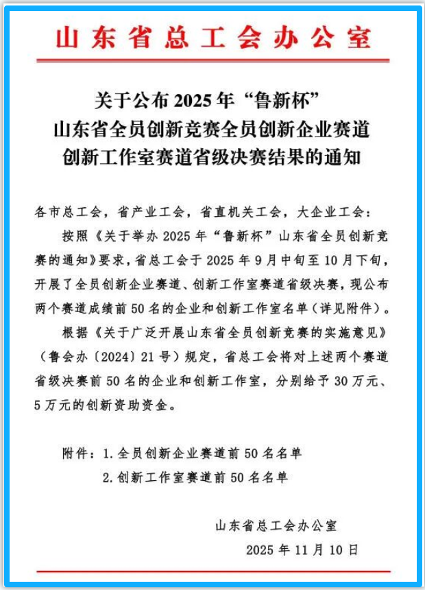 11月10日,2025年“魯新杯”山東省全員創(chuàng)新競賽全員創(chuàng)新企業(yè)賽道決賽結果公布,按照省級決賽名次排序,全省共有50家企業(yè)榮獲“山東省全員創(chuàng)新企業(yè)”稱號,海灣化學榜上有名。