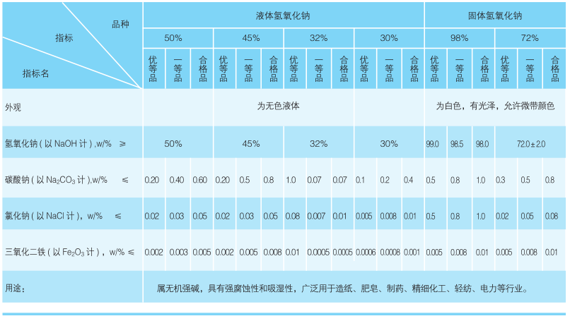 屬無機強堿,易溶于水,溶于乙醇和甘油,不溶于丙醇、乙醚,另有潮解性;與氯、溴、碘等鹵素發(fā)生歧化反應,與酸類發(fā)生中和反應。