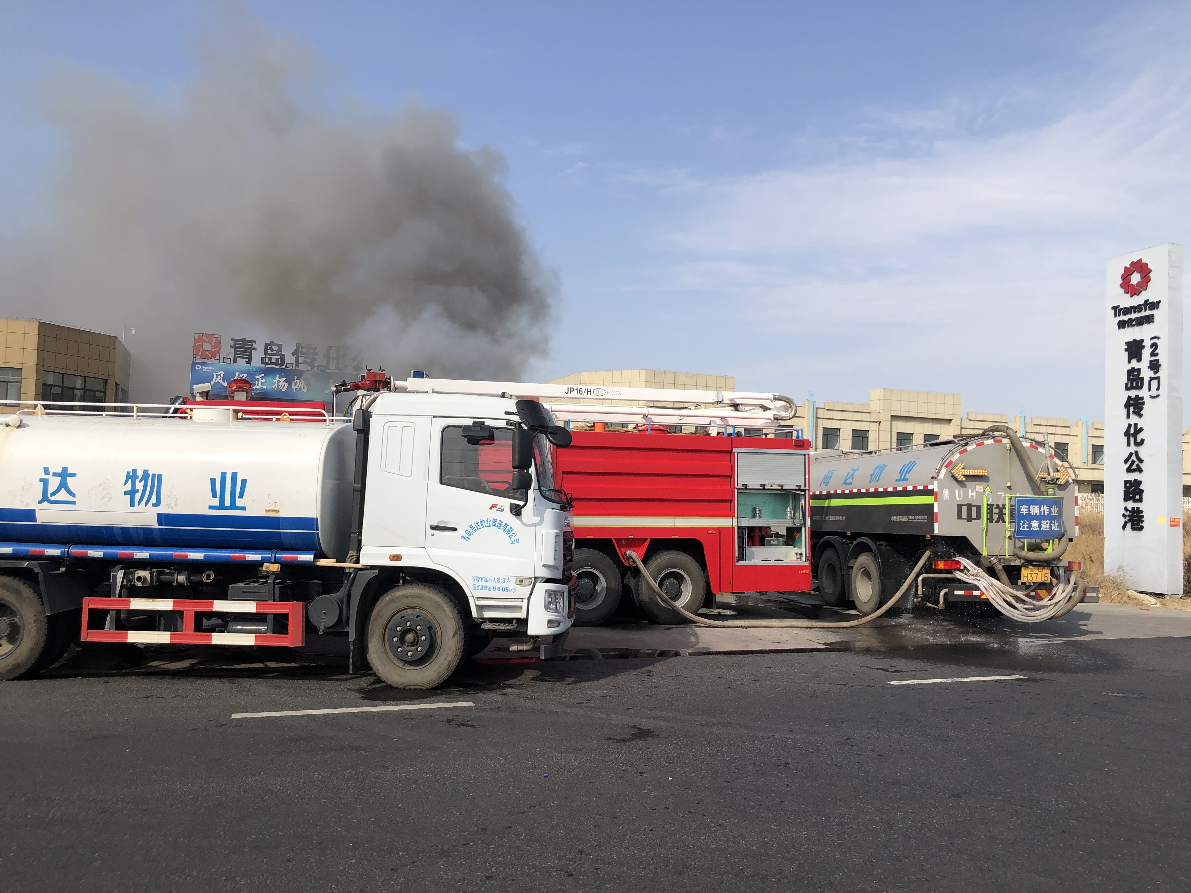 2月23日上午9點(diǎn)30分左右,海達(dá)物業(yè)環(huán)衛(wèi)作業(yè)車駕駛員程龍行駛至青島傳化物流港東門入口處時,發(fā)現(xiàn)不遠(yuǎn)處冒起了滾滾濃煙,原來是一輛載滿貨物的半掛車突發(fā)著火,貨車上滿載空調(diào)外機(jī),易燃的紙殼包裝加上當(dāng)天的大風(fēng)天氣,火勢迅速蔓延至全車。司機(jī)已撥打119火警電話,但消防車還需要一點(diǎn)時間才能趕到。